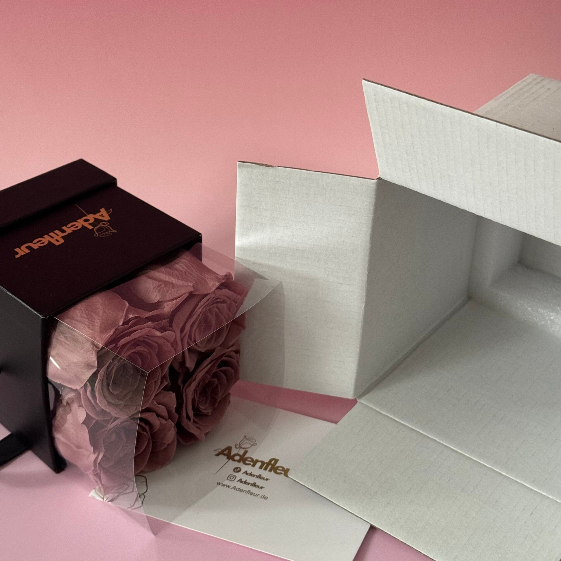Wähle deine Lieblingsfarbe aus unserer vielfältigen Rosenpalette – von klassischem Dunkelrot über zartes Rosa bis hin zu edlem Schwarz – und kombiniere sie mit einer unserer Boxfarben: